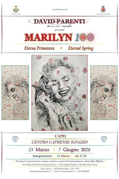 Inaugurazione della mostra artistica di David Parenti dedicata alla figura iconica di Marilyn Monroe, in occasione del centenario della sua nascita. L’esposizione propone opere ispirate al mito senza tempo dell’attrice, celebrandone il fascino e l’eredità culturale. Presentazione a cura dello scrittore e critico cinematografico francese Jean-Max Méjean.