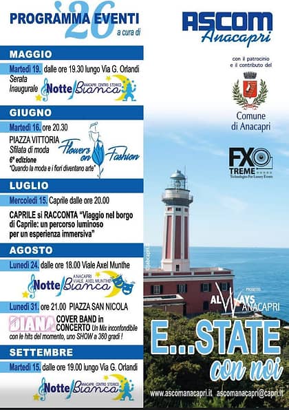 Calendario di eventi estivi che animeranno Anacapri da maggio a settembre 2026, con appuntamenti tra musica, moda, spettacolo e intrattenimento diffusi tra le principali location del territorio. Iniziativa promossa da Ascom Anacapri con il patrocinio del Comune.